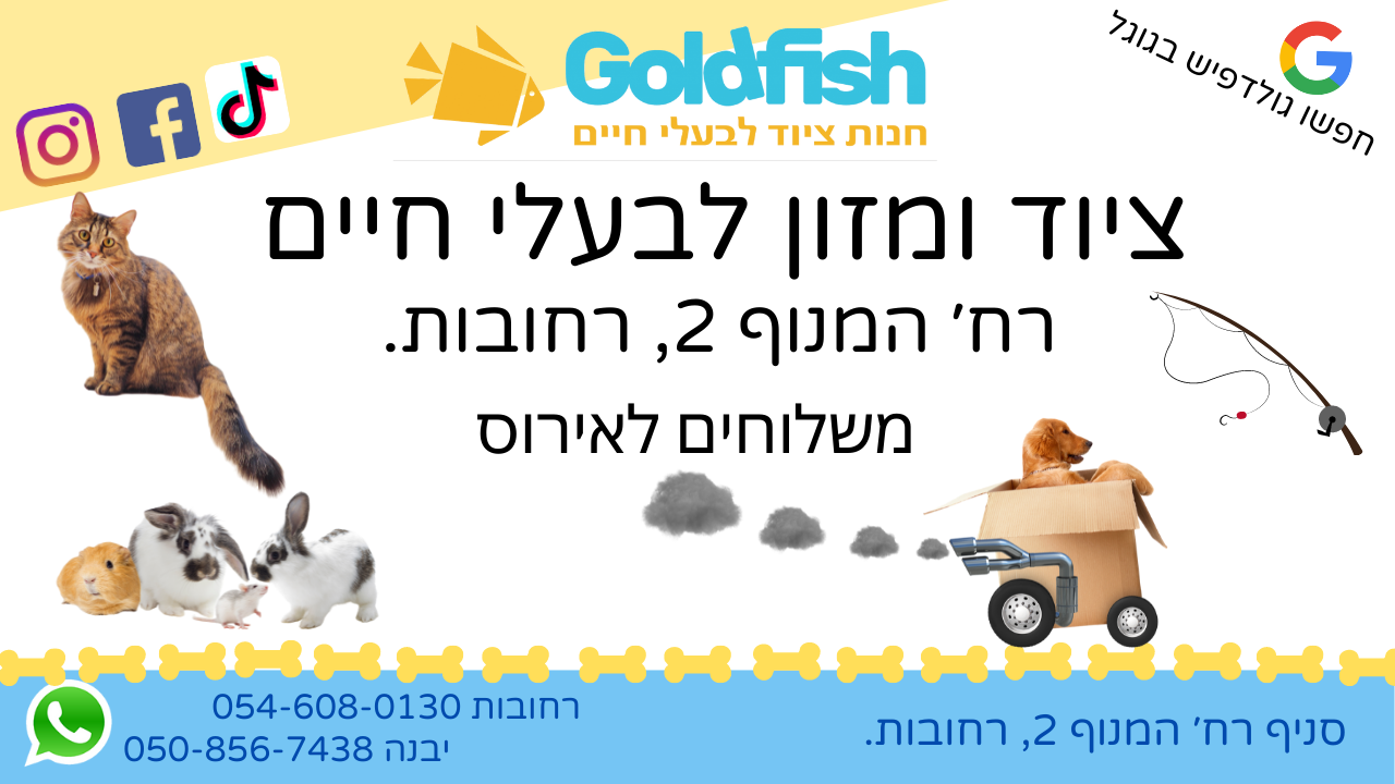 גולדפיש חנות החיות הגדולה והמוכרת ביבנה וברחובות מציעה כעת משלוחי ציוד כולל ומקיף למגוון בעלי חיים הכולל משלוח של כלל סוגי המזון המוצעים והזמינים בחנות. בין המזונות הזמינים בחנות ניתן למצוא מזון יבש ורטוב לכלבים וחתולים וכן מזון משלים, חטיפים ועצמות בשלל גדלים צורות וטעמים. בנוסף לכלבים וחתולים החנות מציע מגוון ציוד ומזונות למכרסמים, כולל אוגרים, ארנבים, צ'ינצ'ילות ועוד! כמו כן ניתן למצוא כל ציוד הנדרש לגידול ציפורים ותוכים.